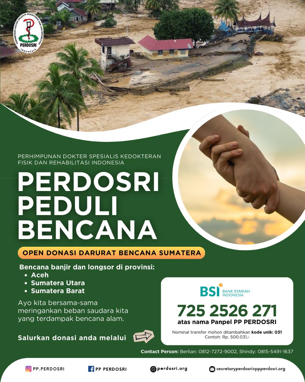 Wanitaindonesianews.com, JAKARTA – Perhimpunan Dokter Spesialis Kedokteran Fisik dan Rehabilitasi Indonesia  (PERDOSRI) menunjukkan kepedulian kepada korban banjir dan longsor di Aceh, Sumatera Utara, dan Sumatera Barat.