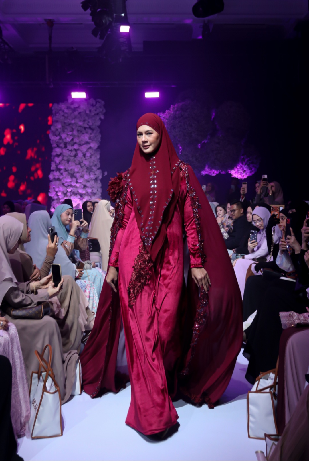 Sementara Celine Evangelista tampil memukau dalam rancangan glamor-syar’i berbahan tulle dengan detail kristal dan siluet flowy yang merepresentasikan kekuatan serta kelembutan perempuan Muslim modern.